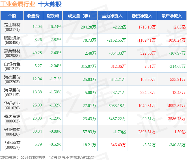 个股表现方面,工业金属行业当日领跌股为楚江新材(002171),该股当日报收12.04,下跌6.23%,成交量204.28万,主力资金净流出2.22亿元。鹏欣资源(600490)以下跌2.82%紧随其后,该股当日成交量78.73万,主力资金净流出2152.65万元。除此之外,豪美新材(002988)、白银有色(601212)、海亮股份(002203)均进入当日熊股之列。具体个股列表见下表: