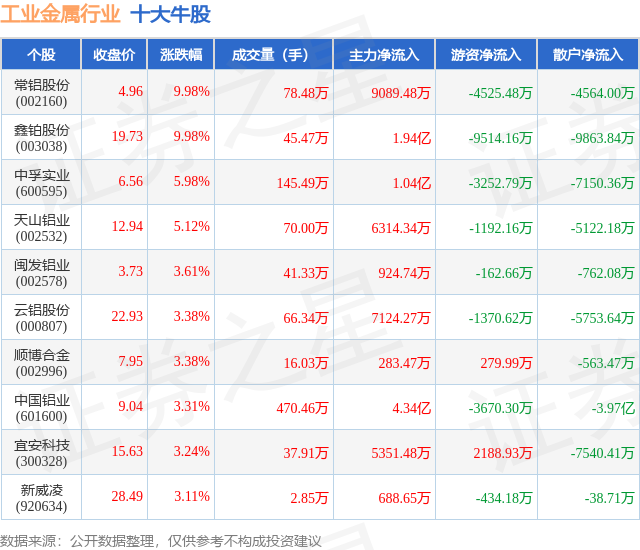 个股表现方面,工业金属行业当日领涨股为常铝股份(002160),该股当日报收4.96,上涨9.98%,成交量78.48万,主力资金净流入9089.48万元。鑫铂股份(003038)以上涨9.98%紧随其后,该股当日成交量45.47万,主力资金净流入1.94亿元。除此之外,中孚实业(600595)、天山铝业(002532)、闽发铝业(002578)均进入当日牛股之列。具体个股列表见下表:
