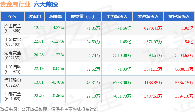 个股表现方面,贵金属行业当日领跌股为招金黄金(000506),该股当日报收12.47,下跌4.37%,成交量71.36万,主力资金净流出1.66亿元。中金黄金(600489)以下跌1.27%紧随其后,该股当日成交量94.59万,主力资金净流出1.45亿元。除此之外,湖南黄金(002155)、山金国际(000975)、恒邦股份(002237)均进入当日熊股之列。具体个股列表见下表: