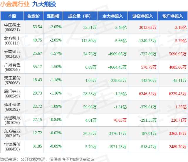 个股表现方面,小金属行业当日领跌股为中国稀土(000831),该股当日报收53.54,下跌2.05%,成交量32.51万,主力资金净流出2.48亿元。北方稀土(600111)以下跌2.05%紧随其后,该股当日成交量112.8万,主力资金净流出5.66亿元。除此之外,云南锗业(002428)、广晟有色(600259)、天工股份(920068)均进入当日熊股之列。具体个股列表见下表: