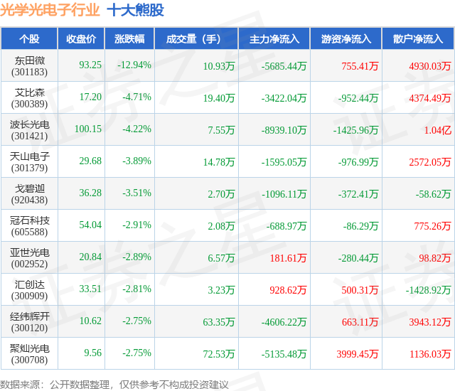 个股表现方面,光学光电子行业当日领跌股为东田微(301183),该股当日报收93.25,下跌12.94%,成交量10.93万,主力资金净流出5685.44万元。艾比森(300389)以下跌4.71%紧随其后,该股当日成交量19.4万,主力资金净流出3422.04万元。除此之外,波长光电(301421)、天山电子(301379)、戈碧迦(920438)均进入当日熊股之列。具体个股列表见下表: