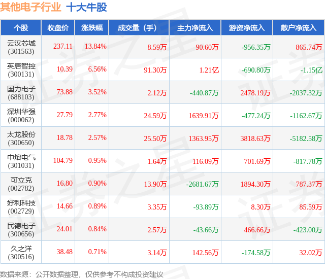 个股表现方面,其他电子行业当日领涨股为云汉芯城(301563),该股当日报收237.11,上涨13.84%,成交量8.59万,主力资金净流入90.6万元。英唐智控(300131)以上涨6.56%紧随其后,该股当日成交量91.3万,主力资金净流入1.21亿元。除此之外,国力电子(688103)、深圳华强(000062)、太龙股份(300650)均进入当日牛股之列。具体个股列表见下表: