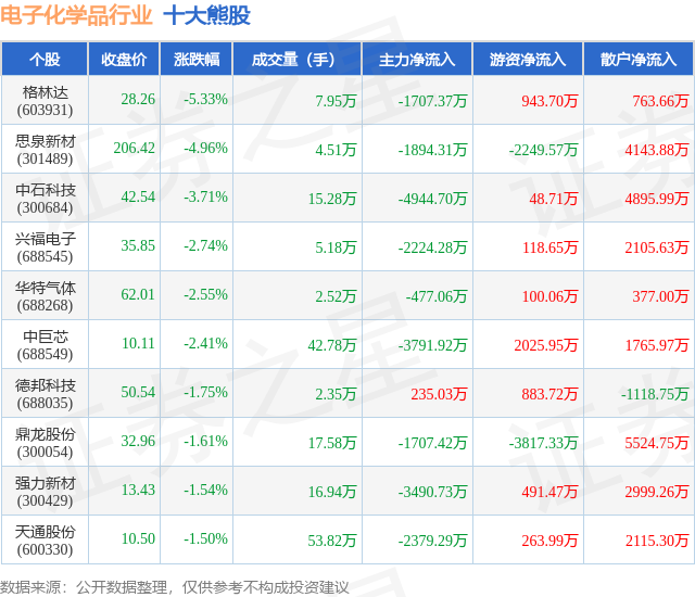 个股表现方面,电子化学品行业当日领跌股为格林达(603931),该股当日报收28.26,下跌5.33%,成交量7.95万,主力资金净流出1707.37万元。思泉新材(301489)以下跌4.96%紧随其后,该股当日成交量4.51万,主力资金净流出1894.31万元。除此之外,中石科技(300684)、兴福电子(688545)、华特气体(688268)均进入当日熊股之列。具体个股列表见下表: