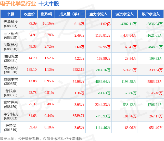 个股表现方面,电子化学品行业当日领涨股为天承科技(688603),该股当日报收79.39,上涨10.16%,成交量6.16万,主力资金净流入1.02亿元。三孚新科(688359)以上涨6.78%紧随其后,该股当日成交量2.49万,主力资金净流入1183.81万元。除此之外,瑞联新材(688550)、濮阳惠成(300481)、同宇新材(301630)均进入当日牛股之列。具体个股列表见下表: