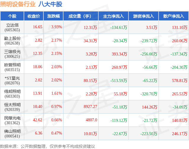 个股表现方面,照明设备行业当日领涨股为立达信(605365),该股当日报收16.65,上涨3.93%,成交量12.31万,主力资金净流出134.61万元。勤上股份(002638)以上涨2.17%紧随其后,该股当日成交量34.31万,主力资金净流出20.34万元。除此之外,三雄极光(300625)、欧普照明(603515)、*ST星光(002076)均进入当日牛股之列。具体个股列表见下表: