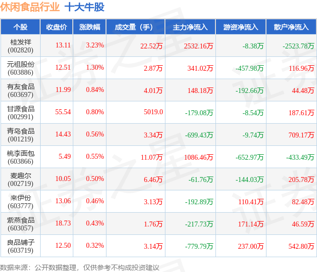 个股表现方面,休闲食品行业当日领涨股为桂发祥(002820),该股当日报收13.11,上涨3.23%,成交量22.52万,主力资金净流入2532.16万元。元祖股份(603886)以上涨1.3%紧随其后,该股当日成交量2.87万,主力资金净流入341.02万元。除此之外,有友食品(603697)、甘源食品(002991)、青岛食品(001219)均进入当日牛股之列。具体个股列表见下表: