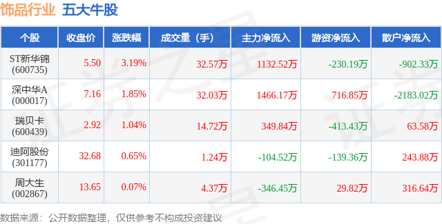 个股表现方面,饰品行业当日领涨股为ST新华锦(600735),该股当日报收5.5,上涨3.19%,成交量32.57万,主力资金净流入1132.52万元。深中华A(000017)以上涨1.85%紧随其后,该股当日成交量32.03万,主力资金净流入1466.17万元。除此之外,瑞贝卡(600439)、迪阿股份(301177)、周大生(002867)均进入当日牛股之列。具体个股列表见下表: