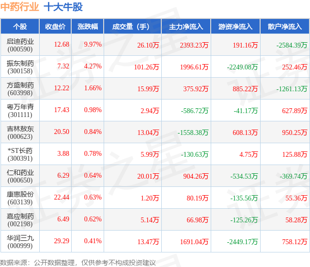 个股表现方面,中药行业当日领涨股为启迪药业(000590),该股当日报收12.68,上涨9.97%,成交量26.1万,主力资金净流入2393.23万元。振东制药(300158)以上涨4.27%紧随其后,该股当日成交量101.26万,主力资金净流入1996.61万元。除此之外,方盛制药(603998)、粤万年青(301111)、吉林敖东(000623)均进入当日牛股之列。具体个股列表见下表: