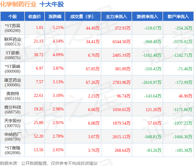 个股表现方面,化学制药行业当日领涨股为*ST苏吴(600200),该股当日报收1.01,上涨5.21%,成交量44.49万,主力资金净流入372.93万元。联环药业(600513)以上涨4.14%紧随其后,该股当日成交量34.41万,主力资金净流入6544.5万元。除此之外,ST诺泰(688076)、*ST景峰(000908)、康芝药业(300086)均进入当日牛股之列。具体个股列表见下表: