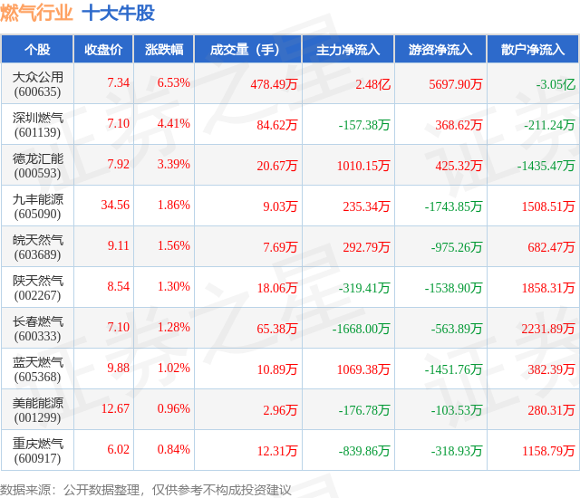 个股表现方面,燃气行业当日领涨股为大众公用(600635),该股当日报收7.34,上涨6.53%,成交量478.49万,主力资金净流入2.48亿元。深圳燃气(601139)以上涨4.41%紧随其后,该股当日成交量84.62万,主力资金净流出157.38万元。除此之外,德龙汇能(000593)、九丰能源(605090)、皖天然气(603689)均进入当日牛股之列。具体个股列表见下表: