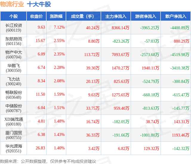 个股表现方面,物流行业当日领涨股为长江投资(600119),该股当日报收9.63,上涨7.12%,成交量40.24万,主力资金净流入8366.14万元。东航物流(601156)以上涨2.55%紧随其后,该股当日成交量8.8万,主力资金净流出823.26万元。除此之外,物产中大(600704)、华鹏飞(300350)、飞力达(300240)均进入当日牛股之列。具体个股列表见下表: