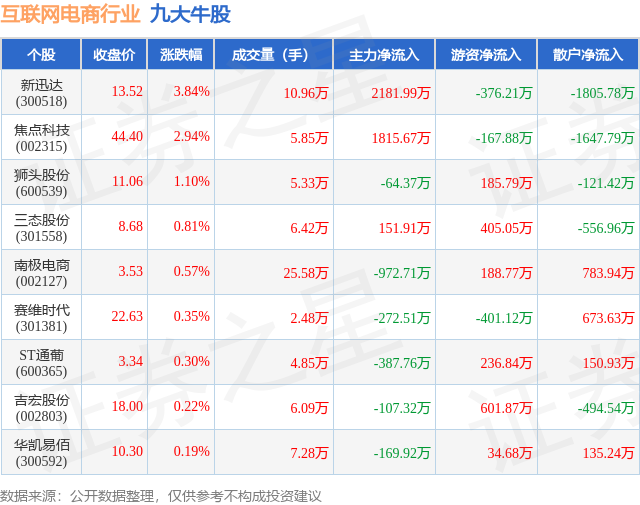 个股表现方面,互联网电商行业当日领涨股为新迅达(300518),该股当日报收13.52,上涨3.84%,成交量10.96万,主力资金净流入2181.99万元。焦点科技(002315)以上涨2.94%紧随其后,该股当日成交量5.85万,主力资金净流入1815.67万元。除此之外,狮头股份(600539)、三态股份(301558)、南极电商(002127)均进入当日牛股之列。具体个股列表见下表: