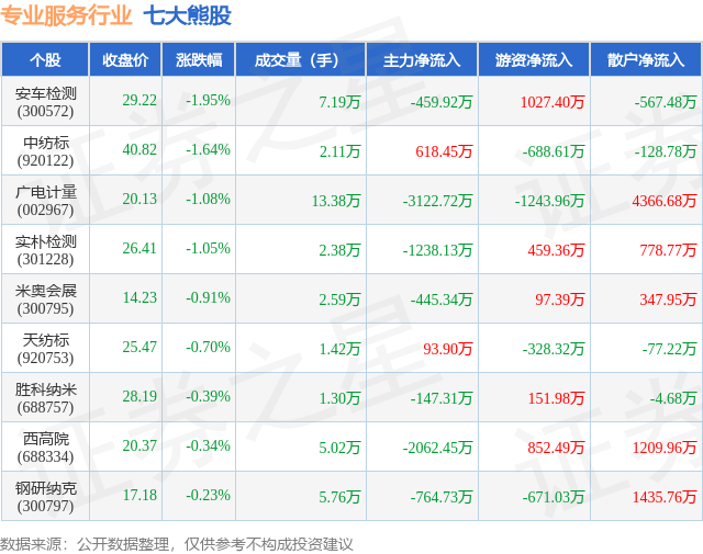 个股表现方面,专业服务行业当日领跌股为安车检测(300572),该股当日报收29.22,下跌1.95%,成交量7.19万,主力资金净流出459.92万元。中纺标(920122)以下跌1.64%紧随其后,该股当日成交量2.11万,主力资金净流入618.45万元。除此之外,广电计量(002967)、实朴检测(301228)、米奥会展(300795)均进入当日熊股之列。具体个股列表见下表: