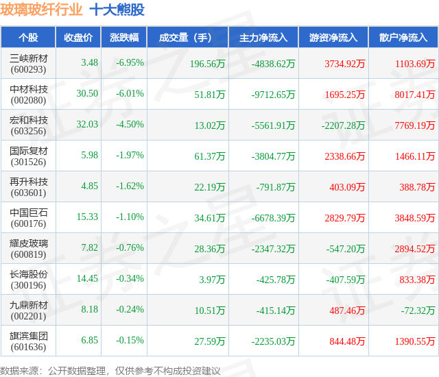 个股表现方面,玻璃玻纤行业当日领跌股为三峡新材(600293),该股当日报收3.48,下跌6.95%,成交量196.56万,主力资金净流出4838.62万元。中材科技(002080)以下跌6.01%紧随其后,该股当日成交量51.81万,主力资金净流出9712.65万元。除此之外,宏和科技(603256)、国际复材(301526)、再升科技(603601)均进入当日熊股之列。具体个股列表见下表: