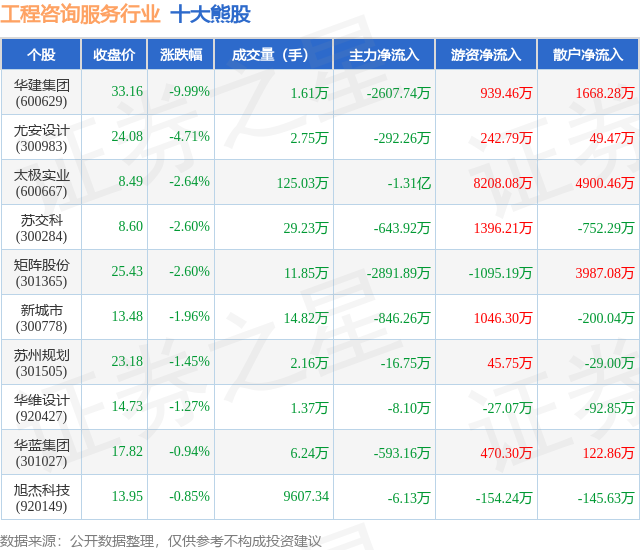 个股表现方面,工程咨询服务行业当日领跌股为华建集团(600629),该股当日报收33.16,下跌9.99%,成交量1.61万,主力资金净流出2607.74万元。尤安设计(300983)以下跌4.71%紧随其后,该股当日成交量2.75万,主力资金净流出292.26万元。除此之外,太极实业(600667)、苏交科(300284)、矩阵股份(301365)均进入当日熊股之列。具体个股列表见下表: