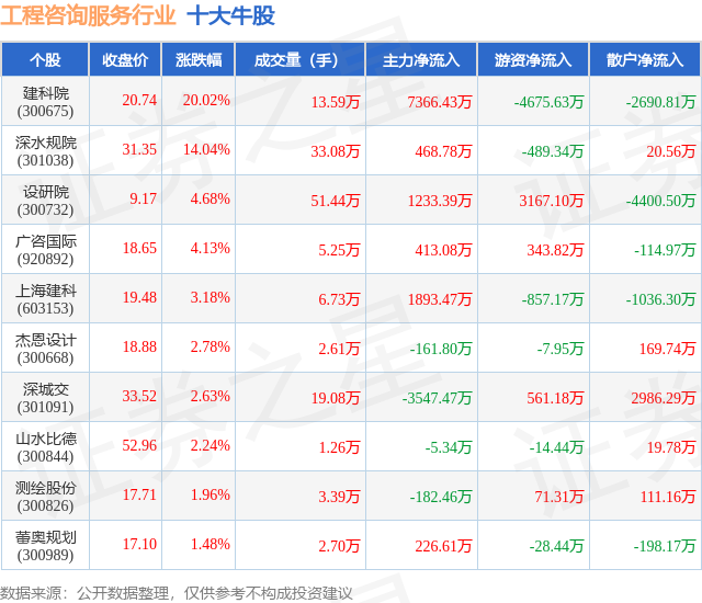 个股表现方面,工程咨询服务行业当日领涨股为建科院(300675),该股当日报收20.74,上涨20.02%,成交量13.59万,主力资金净流入7366.43万元。深水规院(301038)以上涨14.04%紧随其后,该股当日成交量33.08万,主力资金净流入468.78万元。除此之外,设研院(300732)、广咨国际(920892)、上海建科(603153)均进入当日牛股之列。具体个股列表见下表: