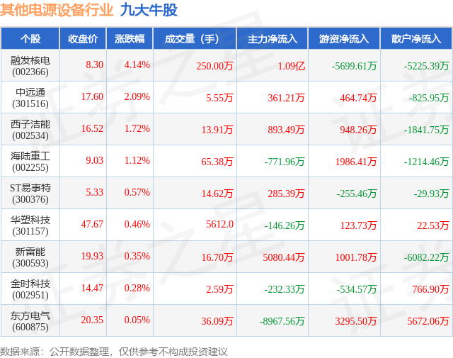 个股表现方面,其他电源设备行业当日领涨股为融发核电(002366),该股当日报收8.3,上涨4.14%,成交量250.0万,主力资金净流入1.09亿元。中远通(301516)以上涨2.09%紧随其后,该股当日成交量5.55万,主力资金净流入361.21万元。除此之外,西子洁能(002534)、海陆重工(002255)、ST易事特(300376)均进入当日牛股之列。具体个股列表见下表: