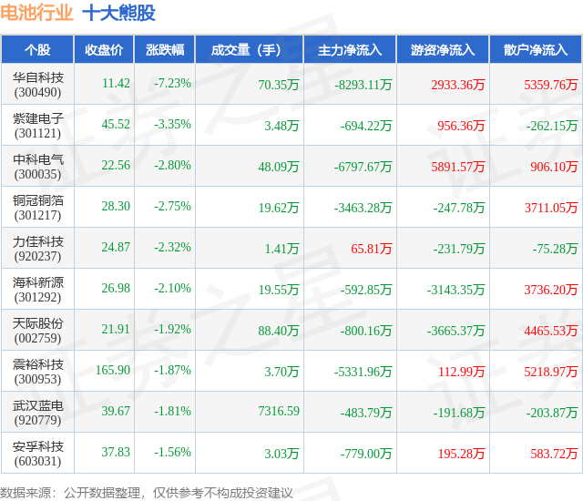 个股表现方面,电池行业当日领跌股为华自科技(300490),该股当日报收11.42,下跌7.23%,成交量70.35万,主力资金净流出8293.11万元。紫建电子(301121)以下跌3.35%紧随其后,该股当日成交量3.48万,主力资金净流出694.22万元。除此之外,中科电气(300035)、铜冠铜箔(301217)、力佳科技(920237)均进入当日熊股之列。具体个股列表见下表:
