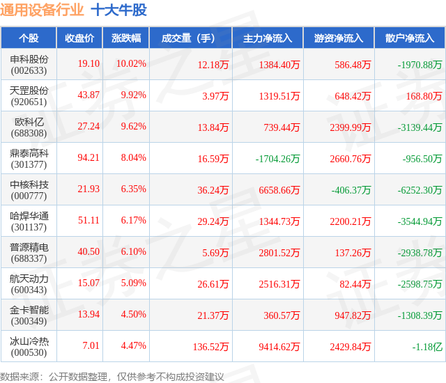 个股表现方面,通用设备行业当日领涨股为申科股份(002633),该股当日报收19.1,上涨10.02%,成交量12.18万,主力资金净流入1384.4万元。天罡股份(920651)以上涨9.92%紧随其后,该股当日成交量3.97万,主力资金净流入1319.51万元。除此之外,欧科亿(688308)、鼎泰高科(301377)、中核科技(000777)均进入当日牛股之列。具体个股列表见下表: