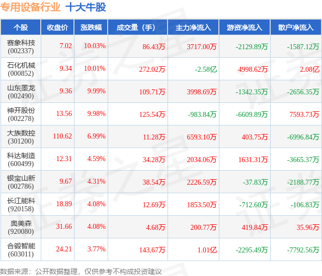个股表现方面,专用设备行业当日领涨股为赛象科技(002337),该股当日报收7.02,上涨10.03%,成交量86.43万,主力资金净流入3717.0万元。石化机械(000852)以上涨10.01%紧随其后,该股当日成交量272.02万,主力资金净流出2.58亿元。除此之外,山东墨龙(002490)、神开股份(002278)、大族数控(301200)均进入当日牛股之列。具体个股列表见下表: