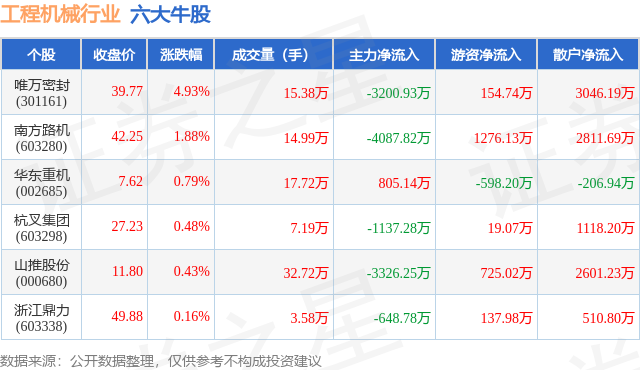 个股表现方面,工程机械行业当日领涨股为唯万密封(301161),该股当日报收39.77,上涨4.93%,成交量15.38万,主力资金净流出3200.93万元。南方路机(603280)以上涨1.88%紧随其后,该股当日成交量14.99万,主力资金净流出4087.82万元。除此之外,华东重机(002685)、杭叉集团(603298)、山推股份(000680)均进入当日牛股之列。具体个股列表见下表: