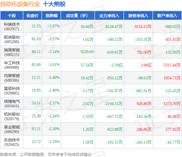 个股表现方面,自动化设备行业当日领跌股为科瑞技术(002957),该股当日报收21.55,下跌3.97%,成交量56.66万,主力资金净流出8124.47万元。凯迪股份(605288)以下跌3.57%紧随其后,该股当日成交量1.02万,主力资金净流出100.52万元。除此之外,瑞晟智能(688215)、华工科技(000988)、均普智能(688306)均进入当日熊股之列。具体个股列表见下表: