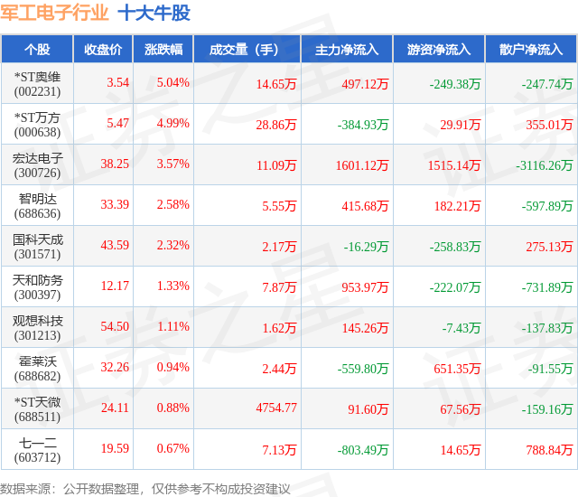 个股表现方面,军工电子行业当日领涨股为*ST奥维(002231),该股当日报收3.54,上涨5.04%,成交量14.65万,主力资金净流入497.12万元。*ST万方(000638)以上涨4.99%紧随其后,该股当日成交量28.86万,主力资金净流出384.93万元。除此之外,宏达电子(300726)、智明达(688636)、国科天成(301571)均进入当日牛股之列。具体个股列表见下表:
