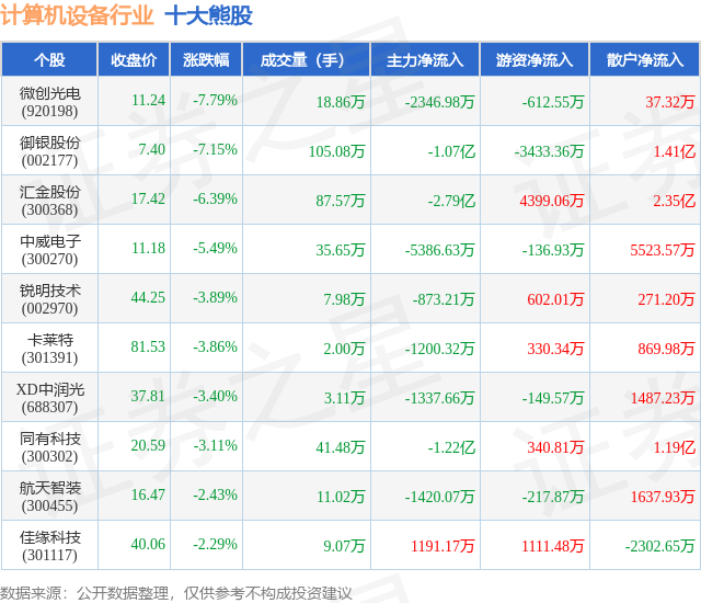 个股表现方面,计算机设备行业当日领跌股为微创光电(920198),该股当日报收11.24,下跌7.79%,成交量18.86万,主力资金净流出2346.98万元。御银股份(002177)以下跌7.15%紧随其后,该股当日成交量105.08万,主力资金净流出1.07亿元。除此之外,汇金股份(300368)、中威电子(300270)、锐明技术(002970)均进入当日熊股之列。具体个股列表见下表: