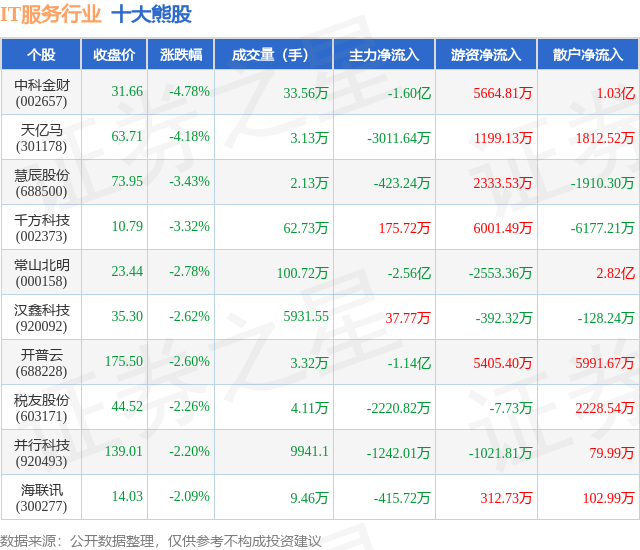 个股表现方面,IT服务行业当日领跌股为中科金财(002657),该股当日报收31.66,下跌4.78%,成交量33.56万,主力资金净流出1.6亿元。天亿马(301178)以下跌4.18%紧随其后,该股当日成交量3.13万,主力资金净流出3011.64万元。除此之外,慧辰股份(688500)、千方科技(002373)、常山北明(000158)均进入当日熊股之列。具体个股列表见下表: