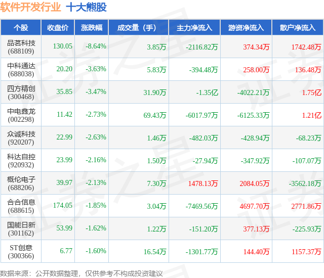 个股表现方面,软件开发行业当日领跌股为品茗科技(688109),该股当日报收130.05,下跌8.64%,成交量3.85万,主力资金净流出2116.82万元。中科通达(688038)以下跌3.63%紧随其后,该股当日成交量5.83万,主力资金净流出394.48万元。除此之外,四方精创(300468)、中电鑫龙(002298)、众诚科技(920207)均进入当日熊股之列。具体个股列表见下表:
