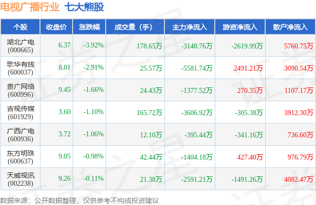 个股表现方面,电视广播行业当日领跌股为湖北广电(000665),该股当日报收6.37,下跌3.92%,成交量178.65万,主力资金净流出3140.76万元。歌华有线(600037)以下跌2.91%紧随其后,该股当日成交量25.57万,主力资金净流出5581.74万元。除此之外,贵广网络(600996)、吉视传媒(601929)、广西广电(600936)均进入当日熊股之列。具体个股列表见下表: