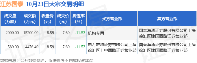 证券之星消息,10月23日江苏国泰发生大宗交易,交易数据如下:
