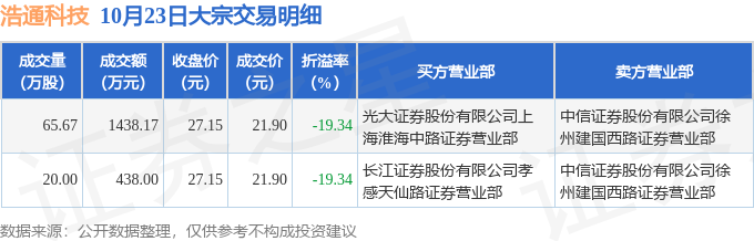证券之星消息,10月23日浩通科技发生大宗交易,交易数据如下: