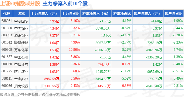 资金流向方面,上证50(000016)指数成份股当日主力资金净流出合计2.42亿元,游资资金净流入合计748.56万元,散户资金净流入合计2.35亿元。成份股资金流向详情见下表: