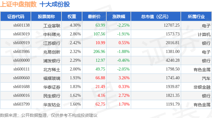 证券之星消息,10月23日,上证中盘(000044)指数报收于4589.18点,涨0.15%,成交1132.02亿元,换手率0.79%。当日该指数成份股中,上涨的有80家,恒力石化以5.83%的涨幅领涨,下跌的有43家,生益科技以4.87%的跌幅领跌。