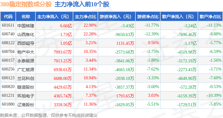 资金流向方面,380稳定(000142)指数成份股当日主力资金净流出合计8.98亿元,游资资金净流出合计3.82亿元,散户资金净流入合计12.79亿元。成份股资金流向详情见下表:
