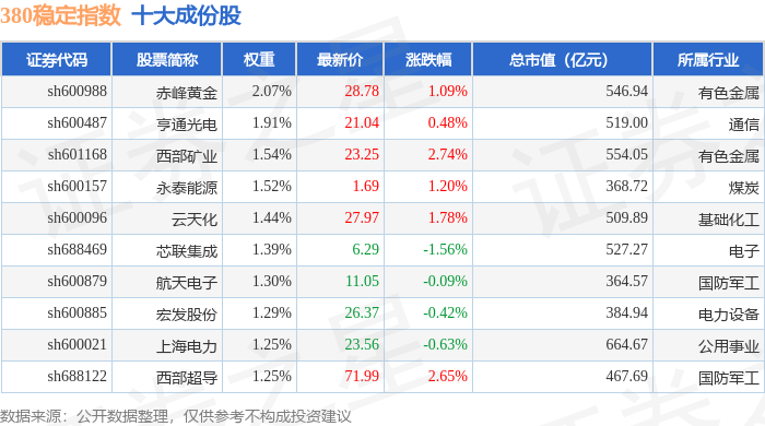 证券之星消息,10月23日,380稳定(000142)指数报收于9709.21点,涨0.49%,成交605.63亿元,换手率1.47%。当日该指数成份股中,上涨的有132家,山西焦化以10.07%的涨幅领涨,下跌的有55家,特宝生物以6.07%的跌幅领跌。