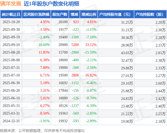 从股价来看,2025年9月30日至2025年10月20日,镇洋发展区间涨幅为4.95%,在此期间股东户数增加900.0户,增幅为4.69%。