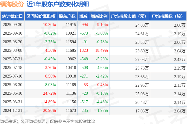 从股价来看,2025年9月10日至2025年9月30日,镇海股份区间涨幅为10.3%,在此期间股东户数增加994.0户,增幅为9.1%。