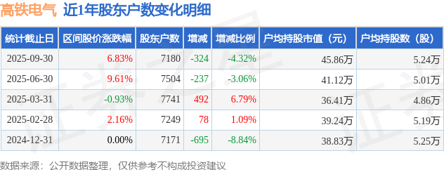 证券之星消息,近日高铁电气披露,截至2025年9月30日公司股东户数为7180.0户,较6月30日减少324.0户,减幅为4.32%。户均持股数量由上期的5.01万股增加至5.24万股,户均持股市值为45.86万元。