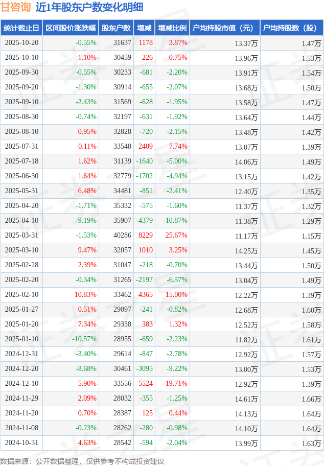从股价来看,2025年10月10日至2025年10月20日,甘咨询区间跌幅为0.55%,在此期间股东户数增加1178.0户,增幅为3.87%。
