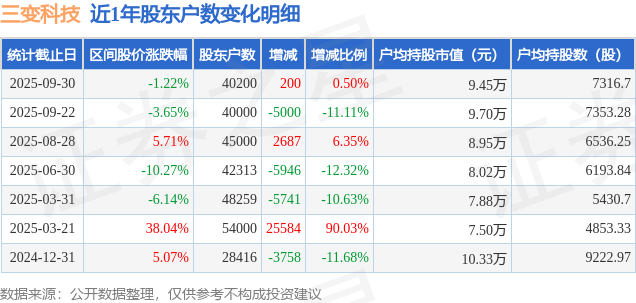 证券之星消息,近日三变科技披露,截至2025年9月30日公司股东户数为4.02万户,较9月23日增加200.0户,增幅为0.5%。户均持股数量由上期的7353.0股减少至7317.0股,户均持股市值为9.45万元。