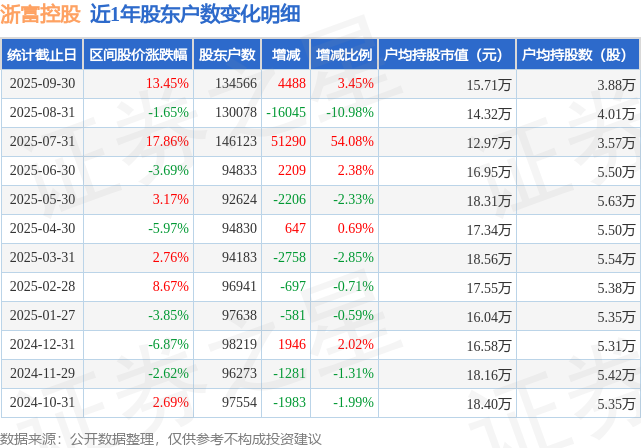 从股价来看,2025年8月31日至2025年9月30日,浙富控股区间涨幅为13.45%,在此期间股东户数增加4488.0户,增幅为3.45%。