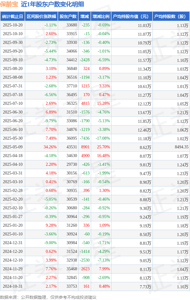 从股价来看,2025年10月10日至2025年10月20日,保龄宝区间跌幅为1.11%,在此期间股东户数减少235.0户,减幅为0.69%。