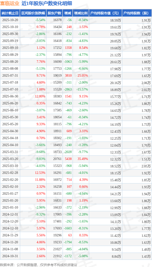 从股价来看,2025年10月10日至2025年10月20日,富临运业区间跌幅为5.54%,在此期间股东户数减少56.0户,减幅为0.34%。