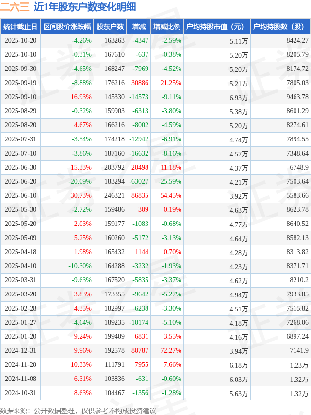 从股价来看,2025年10月10日至2025年10月20日,二六三区间跌幅为4.26%,在此期间股东户数减少4347.0户,减幅为2.59%。