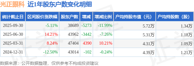 从股价来看,2025年6月30日至2025年9月30日,光正眼科区间跌幅为5.11%,在此期间股东户数减少5273.0户,减幅为11.99%。