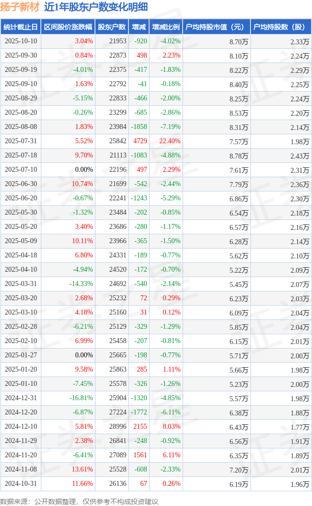 从股价来看,2025年9月30日至2025年10月10日,扬子新材区间涨幅为3.04%,在此期间股东户数减少920.0户,减幅为4.02%。