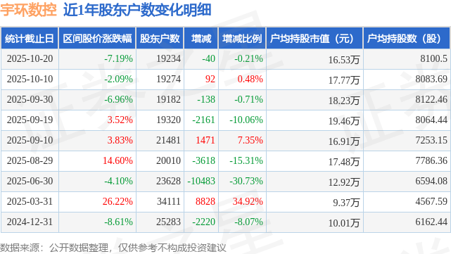 从股价来看,2025年10月10日至2025年10月20日,宇环数控区间跌幅为7.19%,在此期间股东户数减少40.0户,减幅为0.21%。