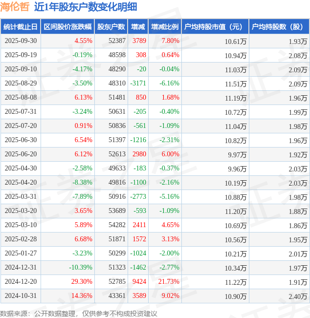 从股价来看,2025年9月19日至2025年9月30日,海伦哲区间涨幅为4.55%,在此期间股东户数增加3789.0户,增幅为7.8%。